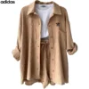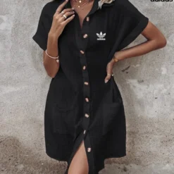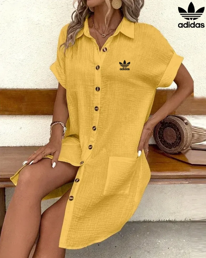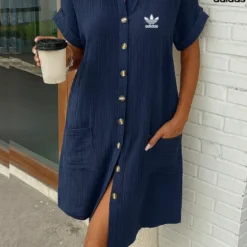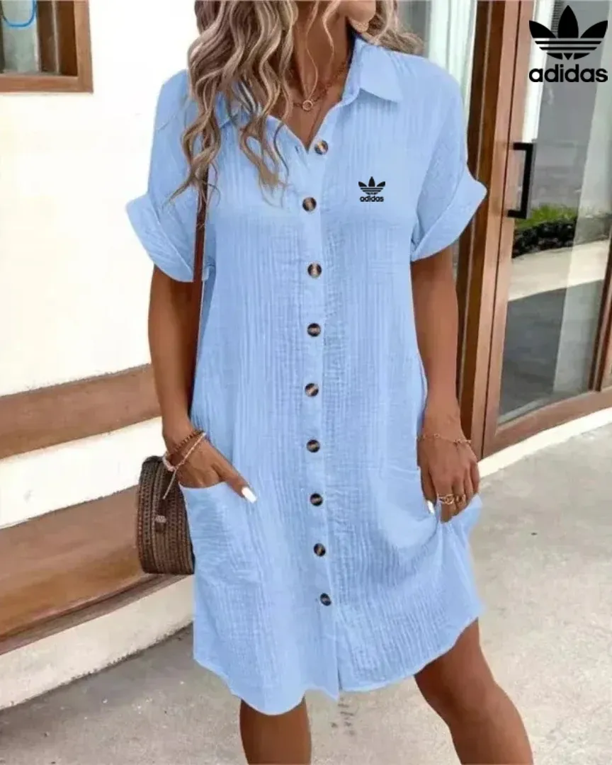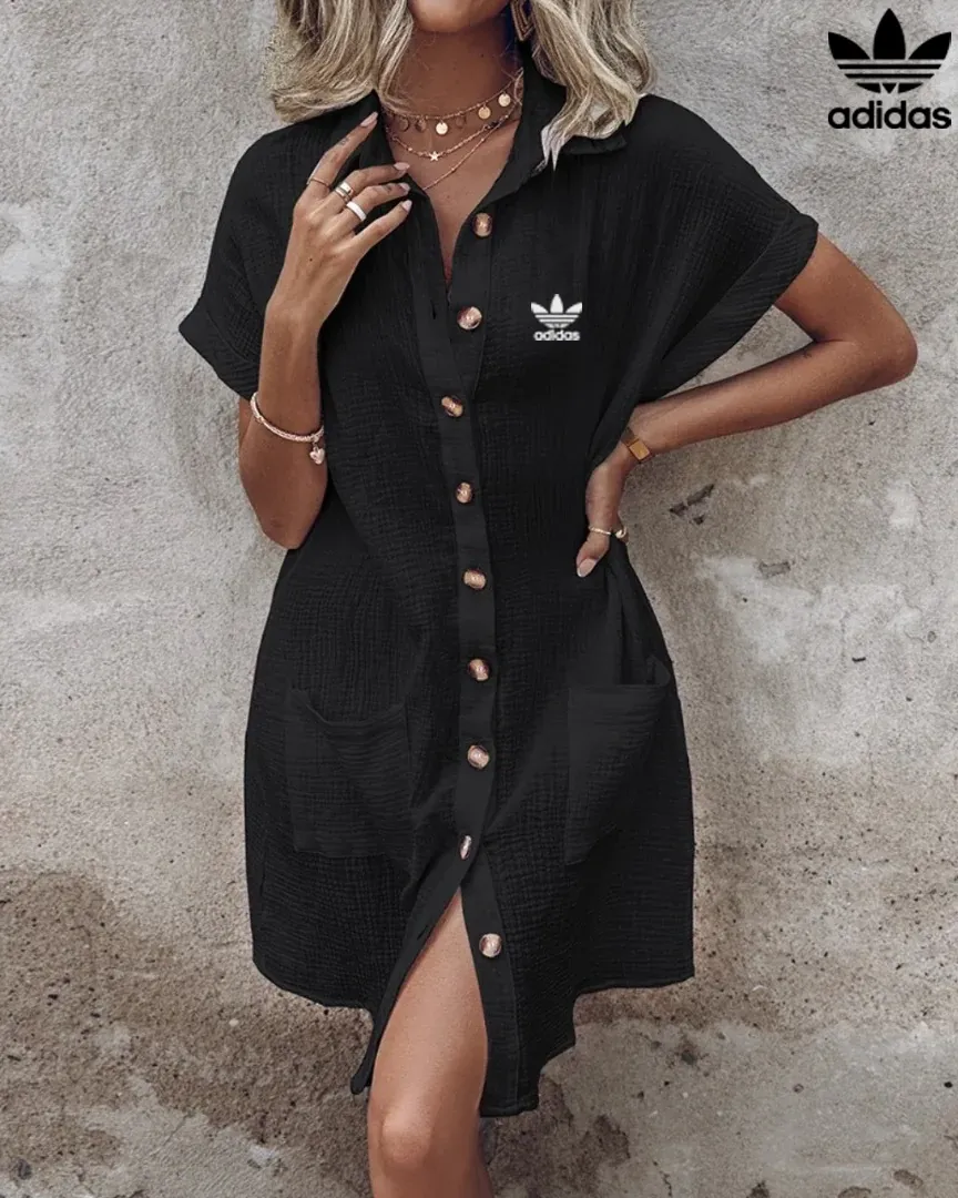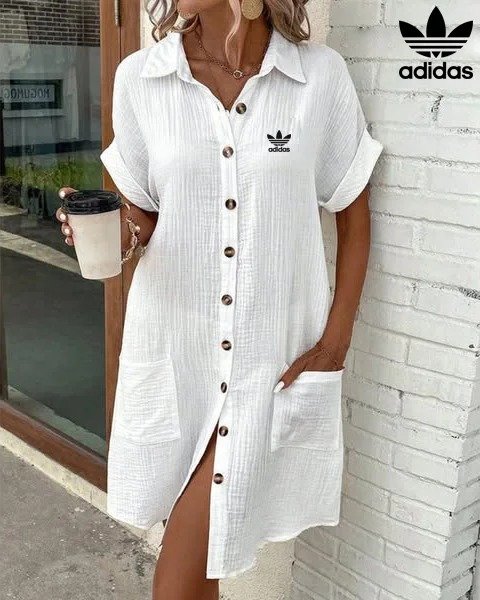 Stay cool and stylish in the adidas women’s short sleeve shirt dress. Made from lightweight, textured cotton-blend fabric, this dress offers all-day breathability with a relaxed fit that drapes effortlessly. The button-front design adds classic shirt styling, while two large front pockets keep your essentials close. Rolled sleeves and the iconic adidas Trefoil logo on the chest finish the look, making it perfect for casual days, summer outings, or a relaxed travel wardrobe.