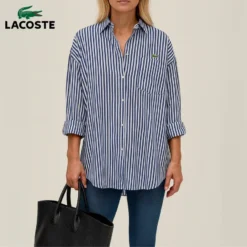 This Lacoste women’s striped button-down shirt is a timeless wardrobe staple that blends elegance with casual comfort. Featuring a classic vertical stripe pattern, it’s designed with a relaxed, oversized fit for effortless style. The shirt comes with long sleeves that can be worn full length or casually rolled up, a front chest pocket, and the iconic Lacoste crocodile logo embroidered on the chest for a signature touch. Available in multiple refreshing colors including pink, green, orange, grey, and navy, it’s perfect for pairing with jeans, trousers, or shorts for both chic and laid-back looks. Crafted from lightweight, breathable fabric, this piece is versatile enough for everyday wear, office looks, or weekend outings.