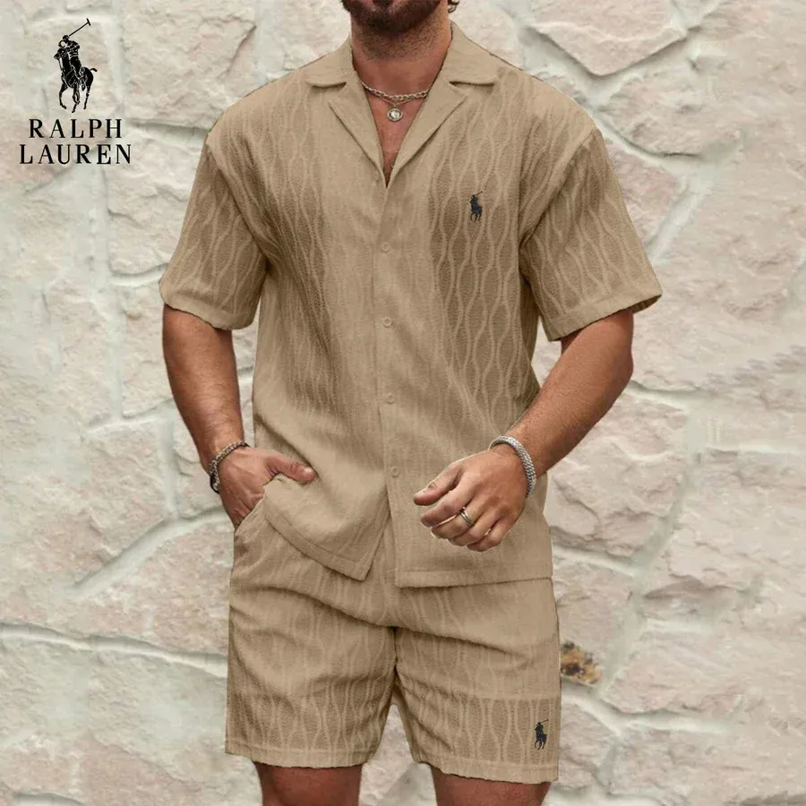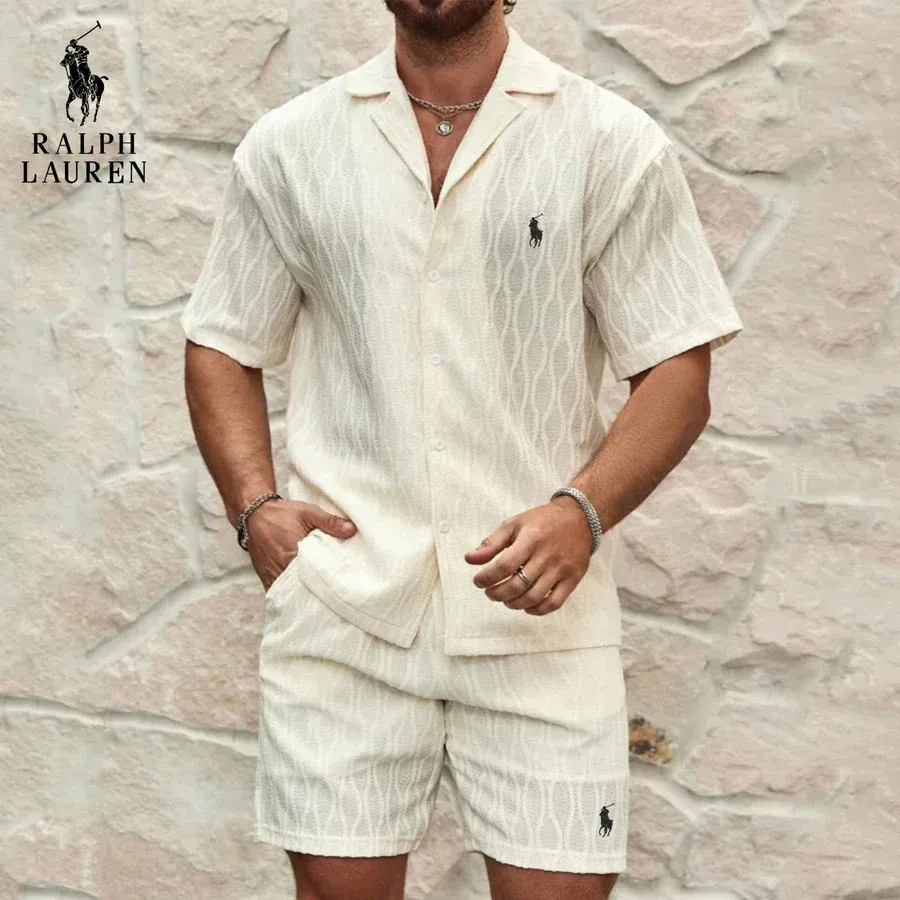 This Ralph Lauren men’s summer co-ord set blends refined elegance with laid-back comfort, perfect for warm weather and relaxed outings. Crafted from lightweight, breathable fabric, the set features a short-sleeve button-down shirt with a relaxed fit and matching shorts for a coordinated look. The subtle textured pattern adds sophistication, while the embroidered Ralph Lauren Polo logo on both the shirt and shorts highlights the brand’s timeless luxury. Designed in a neutral cream tone, this set is versatile and effortlessly stylish, ideal for beach days, vacations, or casual gatherings.