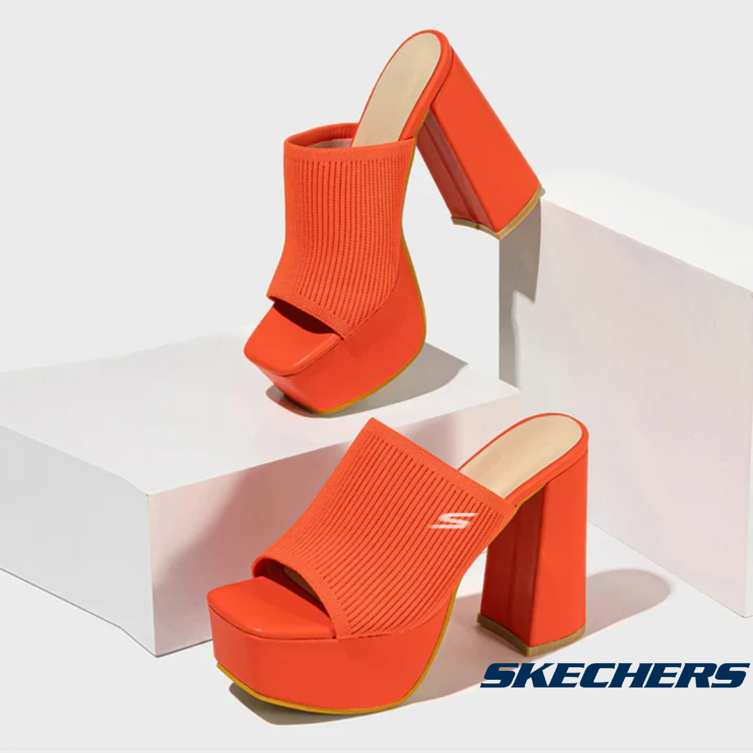 These bold Skechers high-heel platform mules are where comfort meets statement fashion. Designed with a ribbed knit upper that hugs your feet and a cushioned sole for added support, these slip-ons feature a chunky block heel and sturdy platform base that provide height without compromising stability.