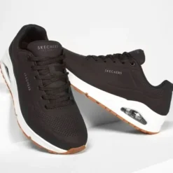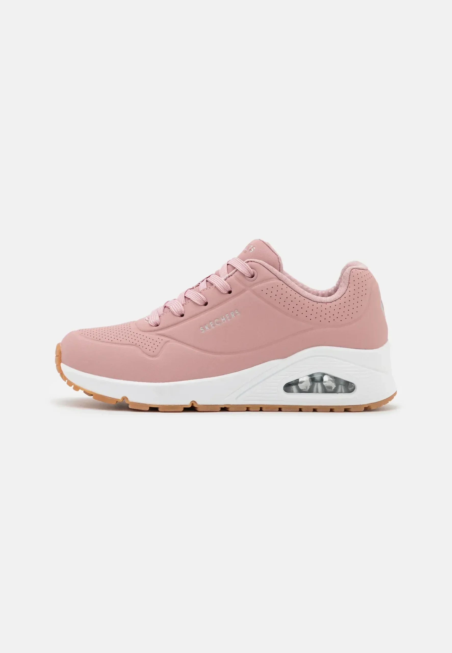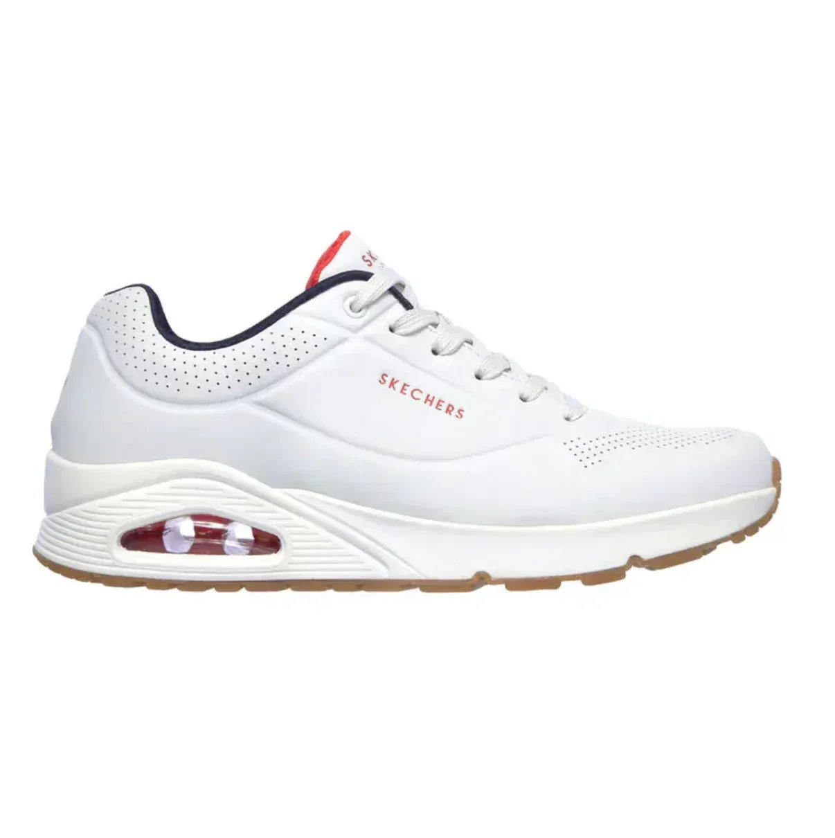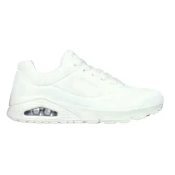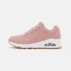 These stylish Skechers sneakers combine comfort and sporty aesthetics with modern color choices. They feature a smooth synthetic upper with perforation accents for breathability, paired with a supportive lace-up design. The visible air-cushion midsole ensures shock absorption, while the gum outsole adds durability and grip. Inside, the Air-Cooled Memory Foam insole provides plush cushioning for all-day wear.