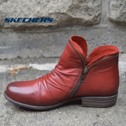 Step out in style and comfort with these premium Skechers ankle boots, crafted from high-quality genuine leather. Designed with a chic ruched texture and a convenient side-zip closure, these boots offer both sophistication and practicality. The low stacked heel ensures all-day wearability, while the soft inner lining provides a snug, comfortable fit. Perfect for pairing with jeans, skirts, or dresses, these boots are available in a range of bold, eye-catching colors — including teal, red, mustard yellow, and deep purple — to match any outfit and mood.