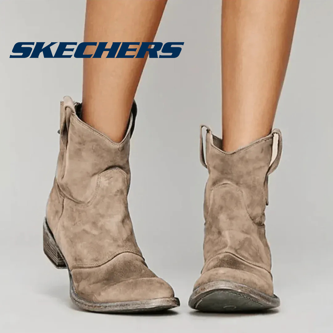 These Skechers women’s mid-calf suede boots feature a rustic, Western-inspired design with a slightly worn-in look.